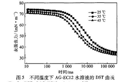 由圖5可知,當(dāng)溫度升高,DST下降的速率明顯加快。這是因?yàn)榉肿拥牟灰?guī)則運(yùn)動(dòng)更加激烈,使得分子間的引力減小。表面張力越早開始下降,在各個(gè)階段的表面張力值就越低。在45℃下開始測(cè)量時(shí),表面張力已經(jīng)降到了70mN/m左右,這也許是由于溫度升高降低了純?nèi)軇┧谋砻鎻埩?。升高溫度,表面張力下降的更快,更易達(dá)到第四個(gè)階段平衡狀態(tài)。這說明了高溫下其動(dòng)態(tài)表面活性更好??赡苁怯捎诒砻婊罨茉诟邷貢r(shí)更低,使得AG.EC分子更易在溶液表面吸附。