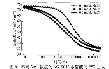 平衡張力研究表明,三種烷基糖苷檸檬酸單酯鹽在其各自的水溶液中均具有表面活性。動(dòng)態(tài)表面張力研究表明,同摩爾濃度AG—EC08、AG.ECIO和AG—EC12水溶液的動(dòng)態(tài)表面活性在達(dá)到一定時(shí)間后隨表面活性劑分子的疏水鏈增長(zhǎng)而不斷增大;AG—EC溶液的濃度越高,其動(dòng)態(tài)表面活性越好,DST越快平衡,DST曲線越低。而當(dāng)溫度升高,其DST明顯下降;無機(jī)電解質(zhì)NaC1對(duì)其DST的影響也較明顯,隨著NaC1濃度增大,其DST曲線越低。