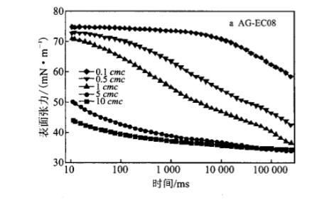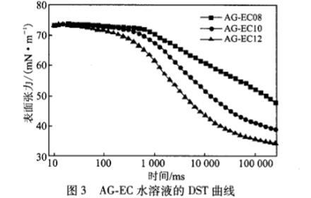 由圖3可知,對(duì)于不同鏈長(zhǎng)的AG.EC水溶液,其DST曲線都是微微下降一快速下降一緩慢平衡的過程。另外在疏水鏈變長(zhǎng)的同時(shí),DST曲線的誘導(dǎo)期時(shí)間縮短,DST下降趨勢(shì)增加,介平衡狀態(tài)表面張力值越低。這是由于疏水烷基鏈增長(zhǎng)使得表面活性劑的疏水性增強(qiáng),更容易吸附到溶液的表面。