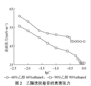 60%乙醇溶液洗脫得到皂苷的得率為39.03%,90%乙醇溶液洗脫得到皂苷的得率為5.01%。由圖2可知,60%乙醇溶液洗脫得到的皂苷臨界膠束濃度為0.35 g/L,最低表面張力為47.43 mN/m;而90%乙醇溶液洗脫得到的皂苷臨界膠束濃度為0.75 g/L,最低表面張力為35.83 mN/m。可以看出,90%乙醇洗脫得到的皂苷臨界膠束濃度更高,最低表面張力更低。說(shuō)明苷元含量越高,其臨界膠束濃度越大,最低表面張力越小。