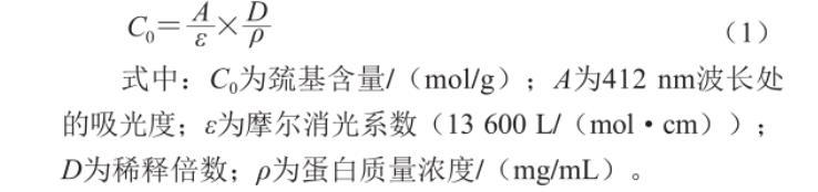 式中:C0為巰基含量/(mol/g);A為412 nm波長處的吸光度;ε為摩爾消光系數(shù)(13 600 L/(molgcm));D為稀釋倍數(shù);ρ為蛋白質(zhì)量濃度/(mg/mL)。