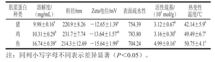 表面疏水性同時又與其他指標(biāo)有著密不可分的關(guān)系,例如熱變性溫度,因為適當(dāng)?shù)臒崽幚頃斐杉{蛋白內(nèi)部疏水基團(tuán)暴露在蛋白質(zhì)表面,從而使蛋白質(zhì)的表面疏水性增強(qiáng),這樣就可以改善蛋白質(zhì)的乳化活性和乳化穩(wěn)定性。3種肌漿蛋白熱變性溫度都較低,在40~55℃之間,其中魚肉肌漿蛋白變性溫度最高而豬肉肌漿蛋白最低,且豬肉肌漿蛋白熱變性溫度與雞肉和魚肉間差異顯著(P<0.05),而雞肉與魚肉肌漿蛋白間的變性溫度無顯著性差異。所以在肌漿蛋白的研究中,如何根據(jù)不同蛋白的變性溫度差異,準(zhǔn)確控制熱處理的強(qiáng)度至關(guān)重要,本研究可給蛋白變性凝聚組裝類的研究提供基礎(chǔ)數(shù)據(jù)的參考。