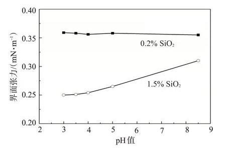 當(dāng)SiO2質(zhì)量分?jǐn)?shù)為1.5%時(shí),納米SiO2/SDS體系靜置不久納米SiO2即聚集在一起,使得SiO2與SDS之間的排斥作用減小,隨著pH值的降低,水化作用力及H+保護(hù)層的形成使得納米SiO2聚集的幾率大大降低,SiO2顆粒在體系中分散較均勻,因此SiO2與SDS之間的排斥作用增大,體系降低油水界面張力的能力增強(qiáng)。當(dāng)SiO2質(zhì)量分?jǐn)?shù)為0.2%時(shí),納米SiO2/SDS體系具有較好的穩(wěn)定性,pH值的下降對體系降低油水界面張力的能力基本無影響。