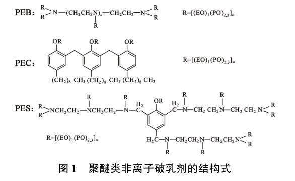 實驗用破乳劑HY01是季銨鹽類陽離子破乳劑,相對分子質(zhì)量約6 000,固含量約35%;其他破乳劑為聚醚類非離子表面活性劑,平均相對分子質(zhì)量均在5 000左右,EO(乙氧基)∶PO(丙氧基)=1∶2.3。3種聚醚類非離子破乳劑的結構式見圖1,其中PEB是支狀聚醚類非離子破乳劑,屬于多乙烯多胺聚氧乙烯聚氧丙烯醚型破乳劑,PEC是梳型聚醚類非離子破乳劑,屬于酚醛樹脂聚氧乙烯聚氧丙烯醚型破乳劑,PES是星型聚醚類非離子破乳劑,屬于酚胺醛樹脂聚氧乙烯聚氧丙烯醚型破乳劑。