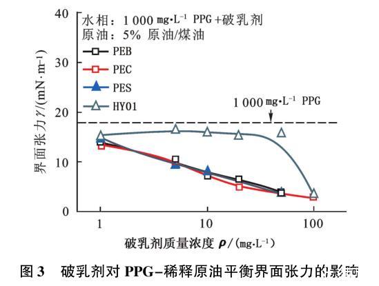 圖3破乳劑對PPG-稀釋原油平衡界面張力的影響