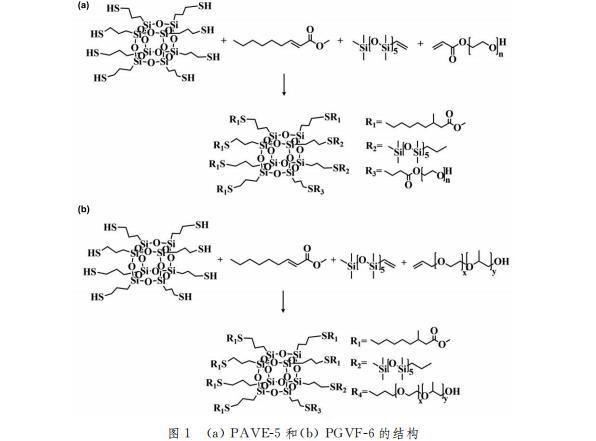在已經(jīng)加入25mL二氯甲烷溶劑的50mL圓底燒瓶中加入定量組分的APEG400、VDMS和FEMA,進行混合溶解,最后加入1%(質(zhì)量分數(shù))的光引發(fā)劑溶解完全后進行封口處理,于溫度為30℃、攪拌速度為300r/min的條件下,放置于紫外燈(20W)照射45min,反應結(jié)束后,旋蒸除去溶劑,最終得到無色透明、流動性明顯且富有粘稠狀態(tài)的液體產(chǎn)物POSS-APEG4001-VDMS2-FEMA5,簡稱為PAVE-5。同樣的方法改變其中之一的單體為APEG750,合成得到POSS-APEG7501-VDMS1-FEMA,簡稱PGVF-6。