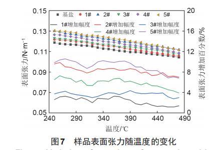 樣品的表面張力值隨溫度變化如圖7所示??梢钥吹?,在250~480℃內(nèi),基鹽的表面張力在0.1044~0.1188N/m,表面張力隨溫度的升高呈下降趨勢。1#納米熔鹽的表面張力在0.1059~0.1219N/m,對數(shù)據(jù)進(jìn)行擬合后,擬合系數(shù)在0.995以上,擬合程度較好。2#納米熔鹽的表面張力在0.1117~0.1301N/m,擬合系數(shù)為0.996,隨溫度變化的趨勢和基鹽及一般熔鹽表面張力的變化趨勢保持一致,均隨溫度的升高呈下降趨勢。3#和4#納米熔鹽的表面張力在0.1075~0.1232 N/m和0.1085~0.1265 N/m,擬合系數(shù)都在0.994以上,其中4#納米熔鹽的擬合系數(shù)與2#納米熔鹽的擬合系數(shù)相同,均為0.996,擬合程度最好。5#納米熔鹽的表面張力在0.1115~0.1305N/m,擬合系數(shù)為0.991。