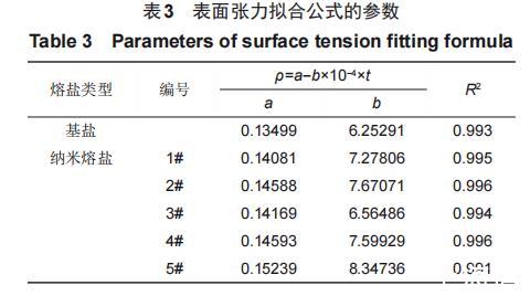 利用拉筒法對配制的基鹽及5種加入30nm SiO2納米顆粒的納米熔鹽的表面張力進(jìn)行測量,每隔10℃進(jìn)行一次測量,對得到的實(shí)驗(yàn)數(shù)據(jù)進(jìn)行整理和分析,擬合公式以及擬合系數(shù)見表3。