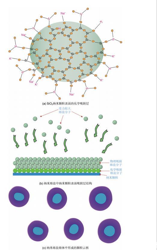 (4)采用高溫熔融法制備納米熔鹽時(shí),由于SiO2納米顆粒表面缺少配位的原子,熔融鹽分子會在SiO2納米顆粒周圍先形成化學(xué)吸附層,隨后由于攪拌的作用,形成物理吸附層,最終以納米云核的形式存在于熔鹽體系中。