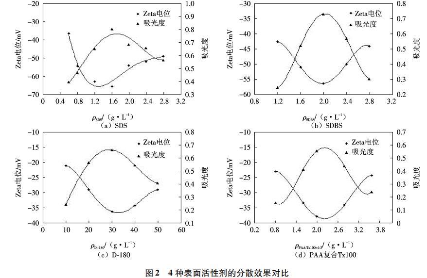 表面活性劑超聲分散法制備CNFs懸浮液的過程如下:量取55mL蒸餾水,分別溶解不同濃度的SDS、PAA復(fù)合Tx100(質(zhì)量比為1:3)、D-180和SDBS,取出5mL表面活性劑溶液,稀釋至20mL,用作紫外/可見分光光度計(jì)測試時(shí)的參比溶液.分別稱取0.01gCNFs溶于剩余50mL分散劑溶液中,機(jī)械攪拌10min,超聲分散15min,得到CNFs懸浮液.