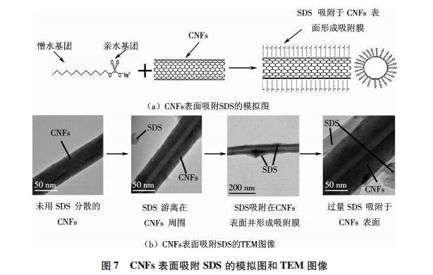 (2)TEM下觀察SDS與SDBS分散的CNFs懸浮液,可以看到CNFs纏結(jié)現(xiàn)象明顯得到改善,可觀察到單根CNF存在,SDS對CNFs的分散效果強于SDBS.