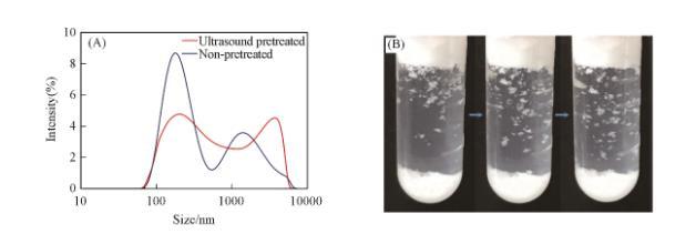 值得注意的是,如果粒子首先用超聲波分散在液體中,然后以相同的方式振蕩,則顆粒產(chǎn)生的泡沫高度有所下降[圖6(A)]。因此對(duì)比了振蕩和超聲波處理后的顆粒在液體中團(tuán)聚體的粒徑大小。采用動(dòng)態(tài)光散射儀間接表征了顆粒在液體中的團(tuán)聚情況[圖7(A)]??梢钥闯?,振蕩后的液體中有較多物質(zhì)的粒徑大于單個(gè)顆粒直徑,而且粒徑分布很寬。這證明液體中存在明顯的顆粒團(tuán)聚體。由于顆粒本身存在巨大的表面能,多數(shù)顆粒在空氣中已經(jīng)自發(fā)團(tuán)聚。顆粒在液體中大多也以團(tuán)聚體的方式存在。少量空氣被密封在浸沒(méi)于油相中的顆粒團(tuán)聚體內(nèi)部,這部分不與外界聯(lián)通的空氣提供了額外的壓力,進(jìn)而阻止了進(jìn)一步滲透。這種顆粒團(tuán)聚體表面同樣形成了由Cassie-Baxter方程描述的復(fù)合表面,該復(fù)合表面的形成保護(hù)了構(gòu)成團(tuán)聚體的顆粒不被完全潤(rùn)濕,并使團(tuán)聚體表面具有合理的疏油性(cosθ_CB的值接近0),從而在熱力學(xué)上團(tuán)聚體便于發(fā)生吸附。而溶液經(jīng)超聲波處理后顆粒被潤(rùn)濕,團(tuán)聚體被破壞使尺寸變小,并且均勻分布在溶液中。圖6(B)顯示了在經(jīng)超聲波處理后的表面張力測(cè)試數(shù)據(jù),同樣表明團(tuán)聚體被破壞后,被潤(rùn)濕的顆粒不再傾向于吸附在表面上。