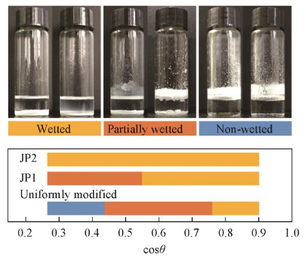 放置在靜止液體表面的顆粒的潤(rùn)濕行為由圖5示出。隨著液體表面張力的增加,從光滑的氟碳鏈覆蓋的表面獲得的cosθ值同時(shí)增大,液體頂部的表面出現(xiàn)明顯的不溶顆粒。這種顆粒不潤(rùn)濕的情況與顆粒形成粗糙表面測(cè)量的結(jié)果具有相關(guān)性。干燥的顆粒以蓬松狀態(tài)直接向油相傾倒,如果在油相表面能形成足夠強(qiáng)壯的、由顆粒組成的亞穩(wěn)態(tài)Cassie-Baxter狀態(tài),那么疏油表面將會(huì)形成,并阻止其它顆粒接觸油相,宏觀表現(xiàn)為顆粒不潤(rùn)濕。相反,如果油相表面由顆粒組成的亞穩(wěn)態(tài)Cassie-Baxter狀態(tài)魯棒性不足,在手動(dòng)振蕩或重力作用下,顆?;蝾w粒團(tuán)聚體接觸油相并浸沒(méi)在油相中。亞穩(wěn)態(tài)魯棒性與顆粒表面材料潤(rùn)濕角密切相關(guān),即不同類型的顆粒具有明顯不同的潤(rùn)濕轉(zhuǎn)折點(diǎn)。JP1潤(rùn)濕性轉(zhuǎn)折點(diǎn)位于均勻修飾顆粒右側(cè),JP2沒(méi)有發(fā)現(xiàn)潤(rùn)濕轉(zhuǎn)折點(diǎn)。這與顆粒上接枝的烷烴鏈數(shù)量有關(guān)。JP2上盡管存在氟碳鏈,但由于烷烴鏈覆蓋的面積太大,使顆粒整體表現(xiàn)出強(qiáng)烈的親油性。