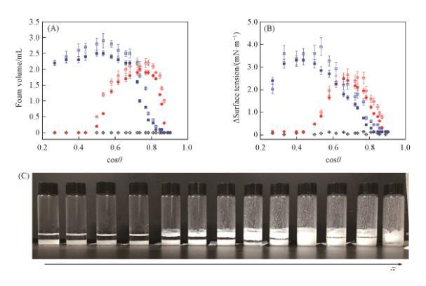 在油相中有無(wú)顆粒條件下的表面張力差如圖6(B)所示。顆粒吸附在表面上會(huì)導(dǎo)致表面張力下降。無(wú)論均勻修飾顆粒還是Janus顆粒,表面張力的下降程度和泡沫體積有一個(gè)最大值。表面張力下降程度的最大值出現(xiàn)時(shí),cosθ大于0.39(θ < 70.1°),而泡沫體積的最大值出現(xiàn)時(shí),cosθ大于0.49(θ < 67.0°)。許多研究人員得到的關(guān)于顆粒穩(wěn)定的泡沫的結(jié)論為:顆粒接觸角等于90°時(shí)泡沫最穩(wěn)定。值得注意的是,在這一結(jié)論中,默認(rèn)顆粒是以單一的、獨(dú)立的形式向界面吸附。如果基于這些理論,在單個(gè)顆粒的接觸角接近90°時(shí),表面張力的下降程度應(yīng)該最大,這與本文研究結(jié)果不符。結(jié)合圖4可見,在粗糙表面的親油-疏油狀態(tài)發(fā)生轉(zhuǎn)變(即cosθ_CB跨越0點(diǎn))的cosθ值附近,表面張力下降幅度最大。這對(duì)應(yīng)著顆粒是否向表面吸附與顆粒構(gòu)成的粗糙表面的接觸角θ_CB相關(guān),而不是單個(gè)顆粒表面的接觸角θ,為此本文開展了進(jìn)一步研究。