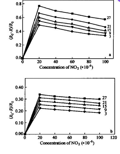 在敏感特性的測(cè)試過(guò)程中,我們發(fā)現(xiàn)純聚苯胺LB膜對(duì)NO?具有較好的敏感性。聚苯胺LB膜的敏感性及響應(yīng)時(shí)間與LB膜的層數(shù)有密切關(guān)系。隨層數(shù)的增加,對(duì)NO?的響應(yīng)時(shí)間逐漸增長(zhǎng),這可以從圖4中看出。