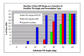 原始配方中超過(guò)一半以上的液滴在20°的傾斜角滾落,40°時(shí),全部液滴滾落。Agrosurf NEC38比Agrosurf SSP更有效,可防止所有液滴在30°時(shí)滾落,避免60%的液滴在40°滾落??蛻艨筛鶕?jù)這種方法,尋找更加優(yōu)異的表面活性劑。