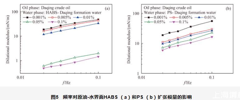 圖5頻率對原油-水界面HABS(a)和PS(b)擴(kuò)張模量的影響