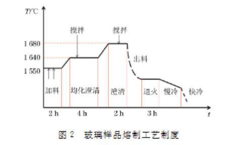 實(shí)驗(yàn)樣品的熔制流程如圖2所示,首先根據(jù)組分設(shè)計(jì)計(jì)算玻璃配方,稱量并配制約500g配合料,在研缽內(nèi)充分研磨、混合均勻,待硅鉬棒電爐升溫至1550 ℃時(shí),將混合均勻的配合料分多次加入預(yù)熱過(guò)的鉑金坩堝中,保溫2h至原料熔化充分后以5 ℃/min的升溫速率加熱至1640 ℃,并在該溫度條件下保溫4h,實(shí)現(xiàn)玻璃的充分熔化與澄清。然后繼續(xù)升溫至1680 ℃保溫2h使玻璃液完全澄清,出料前30 min進(jìn)行攪拌,然后將玻璃液澆筑在預(yù)熱的耐熱鋼模內(nèi),成型后轉(zhuǎn)入780 ℃的馬弗爐內(nèi)進(jìn)行退火處理,保溫3h后再以1 ℃/min降溫速率慢冷至300 ℃,隨爐冷卻得到經(jīng)過(guò)退火的玻璃樣塊。