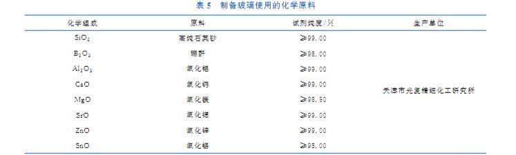 實(shí)驗(yàn)所用的玻璃原料包括石英砂、氧化鋁、硼酐(氧化硼)、氧化鈣、氧化鎂、氧化鍶、氧化鋅,化學(xué)澄清劑所用原料為氧化亞錫,試劑純度等級(jí)均為分析純(AR),實(shí)驗(yàn)設(shè)計(jì)引入成分及使用的原料種類、具體純度如表5所示,所有化學(xué)成分均以氧化物原料的形式引入,玻璃成分中除原料可能含有的部分雜質(zhì)以外,均不含任何人為引入的其他成分。