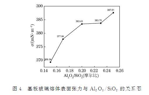 圖4 基板玻璃熔體表面張力與Al?O?/SiO?的關(guān)系圖