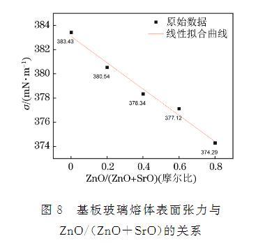 圖8 基板玻璃熔體表面張力與ZnO/(ZnO+SrO)的關(guān)系