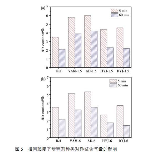 增稠劑溶液的黏度越高,砂漿的流動(dòng)度越低。在較低黏度下,四種增稠劑對(duì)砂漿初始流動(dòng)度的影響接近,60min時(shí),AD的經(jīng)時(shí)流動(dòng)度最低,VAM流動(dòng)度相對(duì)于基準(zhǔn)砂漿略微下降;然而當(dāng)溶液黏度提高至6mPa·s時(shí),摻入HYJ和DYJ的砂漿流動(dòng)度顯著低于AD和VAM,60min后的損失也更大,AD的經(jīng)時(shí)流動(dòng)度略低于基準(zhǔn)砂漿。