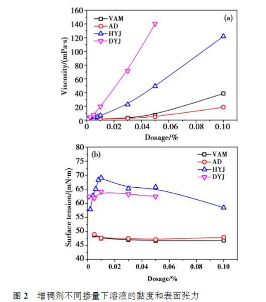 相同摻量下,DYJ的黏度最高,其次是HYJ,VAM和AD黏度在低摻量下接近,摻量達(dá)到0.10%之后,VAM黏度高于AD;VAM和AD的黏度隨著摻量的提高緩慢增大,而HYJ和DYJ溶液的黏度隨摻量的提高迅速提高,尤其是DYJ的增長幅度更為顯著??傮w來看,增稠劑分子量越大,相同摻量時(shí)溶液的黏度越高。從表面張力的結(jié)果來看,相同摻量下,HYJ溶液的表面張力最高,其次是DYJ,VAM和AD的表面張力顯著低于其他兩種增稠劑,且AD略微高于VAM.