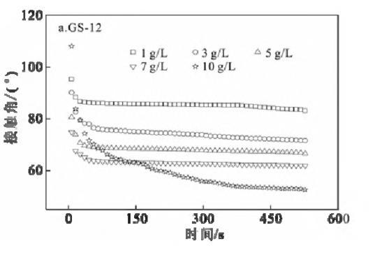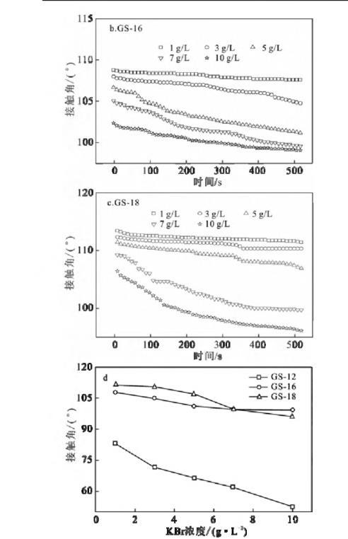 在KBr濃度區(qū)間1~10 g/L內(nèi),GS-12隨著KBr濃度的增加,接觸角顯著減小,而GS-16和GS-18則變化不明顯。可以解釋為:對(duì)于GS-12而言,KBr濃度越高,固/液界面處的填料越緊密,導(dǎo)致氣/液固界面張力值降低,而疏水鏈較長(zhǎng)的GS-16和GS-18其自身降低界面張力的能力有限,所以,隨KBr濃度增加,接觸角變化有限[1,19]。此外,隨著KBr濃度的增加,液滴在石蠟?zāi)ど系慕佑|角值減小。