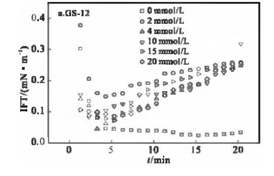 用界面張力儀無(wú)法得到GS-18的界面張力值。因?yàn)楸砻婊钚詣┓肿邮杷湹难娱L(zhǎng),降低了表面活性劑分子向油水界面的擴(kuò)散速度,導(dǎo)致表面活性劑的表面活性降低。隨著KBr的加入,IFT曲線出現(xiàn)異常變化,部分IFT曲線隨著KBr濃度的增加先減小后增大??赡艿脑蚴牵弘S時(shí)間的延長(zhǎng),油/水界面表面活性劑吸附量逐漸增加,IFT持續(xù)降低,在IFT達(dá)到最低值時(shí),界面表面活性劑吸附量達(dá)到最大值。與空氣/水界面不同的是油/水界面表面活性劑與有機(jī)相存相容性,隨著時(shí)間的延長(zhǎng),界面吸附的部分表面活性劑分子會(huì)從界面逐漸向有機(jī)相遷移,從而造成IFT升高。