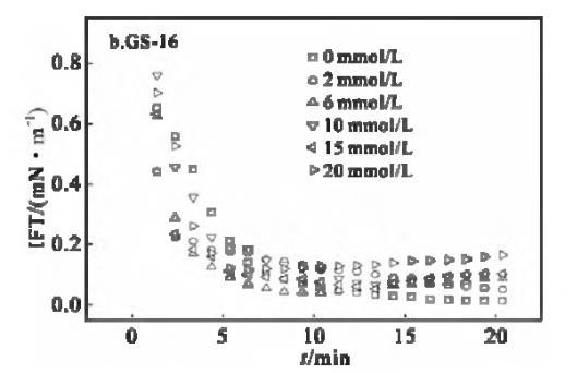 表面活性劑/油體系的動(dòng)態(tài)界面張力行為,對(duì)驅(qū)油過(guò)程具有重要意義。動(dòng)態(tài)界面張力是驅(qū)油過(guò)程中各種復(fù)雜物理化學(xué)反應(yīng)的具體體現(xiàn)。因此,研究動(dòng)態(tài)界面增長(zhǎng)力及其影響因素非常重要。溶液中離子強(qiáng)度增加,將影響表面活性劑分子在水相中的溶解度,改變雙電層參量,而導(dǎo)致油水界面表面活性劑濃度的改變。一般情況下,添加的鹽可以通過(guò)中和表面活性劑分子在界面上頭基的電荷來(lái)減弱表面活性劑分子之間的靜電斥力,導(dǎo)致IFT降低[5]。溫度為30℃下,不同KBr鹽濃度下,GS-12,GS-16的煤油/表面活性劑溶液界面張力隨時(shí)間的變化曲線見(jiàn)圖6。