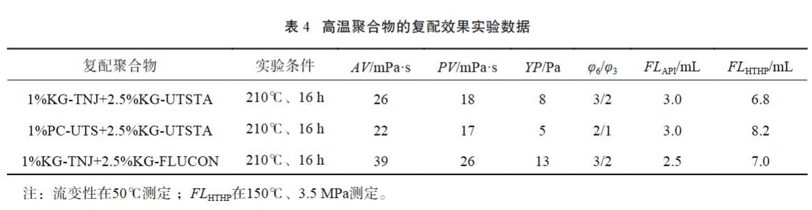 室內(nèi)以濾失改善效果較好的1%DrilFILHT為基礎(chǔ),考察增黏劑KG-TNJ、PC-UTS與2種抗超高溫改性淀粉的復(fù)配效果,選定材料最佳組合。評價(jià)配方:基礎(chǔ)配方+1.0%DrilFILHT+復(fù)配聚合物,實(shí)驗(yàn)結(jié)果見表4。