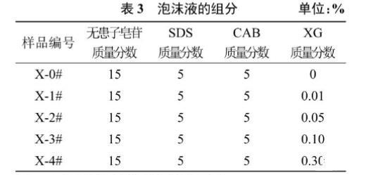 表3為泡沫溶液的配方。根據(jù)三元復配體系的發(fā)泡性能,選取發(fā)泡性能最佳的9號組,無患子皂苷、SDS、CAB質量分數(shù)固定在15%、5%、5%。研究XG濃度變化對泡沫溶液性能的影響。