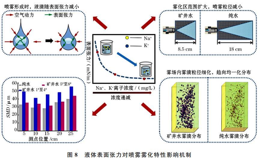 結(jié)合試驗結(jié)果,得到礦井水Na+、K+濃度對噴霧霧化特性的影響機(jī)制如圖8所示。溶液中Na+、K+等離子濃度通過改變其表面張力,間接影響噴霧霧場性能。當(dāng)溶液中Na+、K+等離子濃度減小,氣-水界面對離子排斥作用減弱,導(dǎo)致溶液表面張力減小。