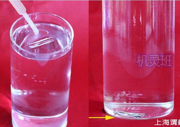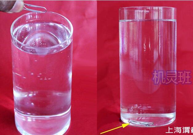 1、將回形針放入一杯水中,回形針會(huì)下沉至玻璃杯的底部!