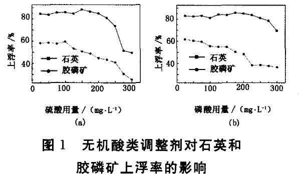 硫酸和磷酸是較為有效的膠磷礦抑制劑,工業(yè)應(yīng)用廣泛??疾靷鹘y(tǒng)調(diào)整劑對(duì)石英和膠磷礦可浮性的影響,結(jié)果見圖1。
