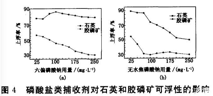 除了上述調(diào)整劑,含有磷酸根的六偏磷酸鈉及無(wú)水焦磷酸鈉也可抑制膠磷礦,這類磷酸鹽除了可以在酸性條件下抑制膠磷礦外,還能在礦漿中起到一定的分散作用。試驗(yàn)結(jié)果見圖4。