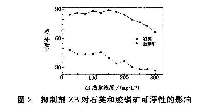 從圖2看出,ZB對(duì)膠磷礦和石英的抑制效果明顯,當(dāng)ZB用量為150 mg/L時(shí),兩者上浮率差異達(dá)到最佳,為54.90個(gè)百分點(diǎn)。與圖1對(duì)比可知,使用ZB做調(diào)整劑時(shí),可在用量較低時(shí)得到更好的抑制效果。并對(duì)添加ZB后的礦漿pH值進(jìn)行測(cè)定,當(dāng)ZB用量達(dá)到150 mg/L時(shí),礦漿pH為1.2左右;當(dāng)ZB用量超過200 mg/L時(shí),石英上浮率仍保持在70%以上,說明使用ZB不會(huì)造成石英上浮率明顯下降,更有利于膠磷礦和石英的有效分離。