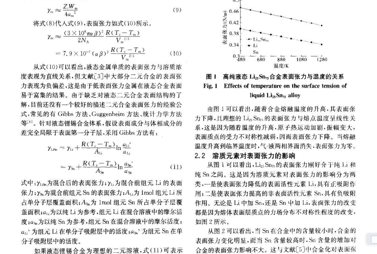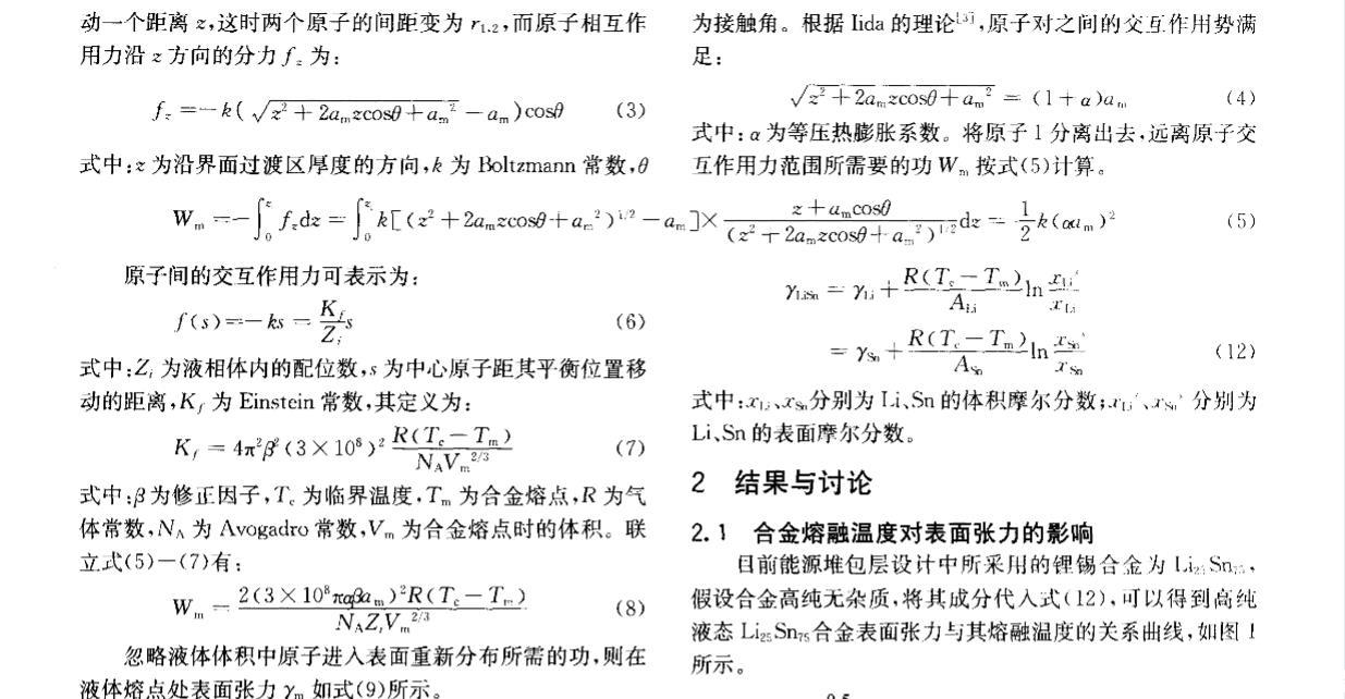 核能是公認現(xiàn)實可行的、可大規(guī)模替代常規(guī)能源的清潔能源。聚變堆或聚變_裂變混合堆液態(tài)金屬包層因其固有特性和優(yōu)勢,在國際上被普遍認為是未來電站最具發(fā)展?jié)摿Φ陌鼘釉O計方案之一。作為包層氚增殖劑和冷卻劑的鋰錫合金與鋰鉛合金一樣,具有廣闊的發(fā)展前景,其制備、純化、質(zhì)量輸運等工藝難題正逐步得到重視。液態(tài)金屬的表面張力不僅是認識和理解冶煉過程最基本的物理量之一,而且是氣體吸收、氣泡形核、雜質(zhì)生長等界面現(xiàn)象的控制因素。目前對液態(tài)金屬表面張力的研究多集中于金屬單質(zhì),合金的表面或界面行為在理論或?qū)嶒炆隙枷喈敳蛔?,主要是由于精確確定表面張力十分困難[2]。針對液態(tài)鋰錫合金這種新型的核材料,從基礎研究方面看,目前還沒有一種實驗方法能確定液體界面的結(jié)構(gòu),即兩個相之間過渡區(qū)域的結(jié)構(gòu),因此需要有一些假設或模型來滿足表面張力理論的研究。