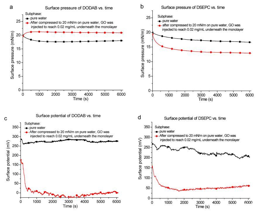 圖 2. (a) DODAB 和 (b) DSEPC 單層的表面壓力與經(jīng)過時(shí)間的關(guān)系。 單層的表面電位與經(jīng)過時(shí)間的關(guān)系 (c) DODAB 和 (d) DSEPC。 黑色曲線:?jiǎn)螌釉诩兯畞喯嗌媳粔嚎s到 20 mN/m 的表面壓力。 紅色曲線: 將單層壓縮至 20 mN/m 后,將 600 μL 1 mg/mL GO 分散體小心緩慢注入單層下方 進(jìn)入水亞相以達(dá)到 0.02 mg/mL 的 GO。