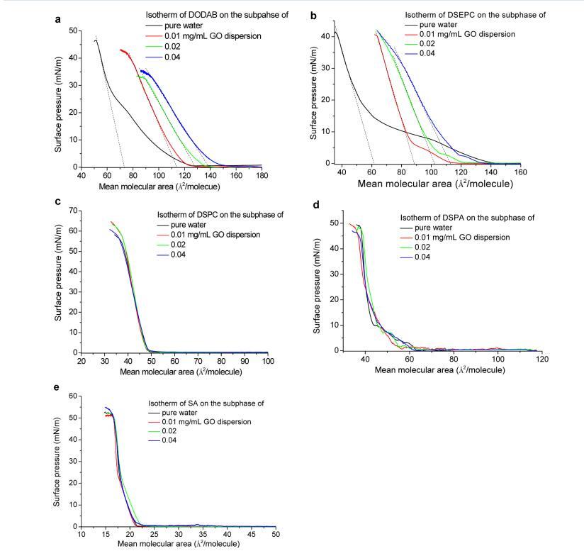 圖 1. 空氣-水或 GO 分散界面處脂質(zhì)的表面壓力-面積等溫線:(a) 帶正電荷的 DODAB; (b) 積極 收費(fèi) DSEPC; (c) 帶中性電荷的 DSPC; (d) 帶負(fù)電的 DSPA; (e) 帶負(fù)電的 SA。 請(qǐng)注意,沒有表面壓力 在空氣-GO 分散界面處檢測(cè)到,而沒有在界面處擴(kuò)散脂質(zhì)。 每個(gè)分子軸面積的虛線的截距 表示每個(gè)分子的極限面積。
