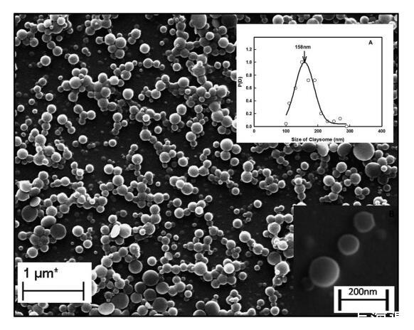圖1顯示由納米粘土(0.05%)和姜黃素納米顆粒形成的粘土小體組裝體的SEM圖像。插圖(A)顯示了粘粒的高斯粒度分布(從SEM圖像獲得)。發(fā)現(xiàn)大多數(shù)粘土體(核-殼)顆粒的直徑為158±5 nm。插圖(B)顯示了由納米粘土殼和殼厚度為40 nm的姜黃素納米顆粒核形成的單個(gè)粘土體。