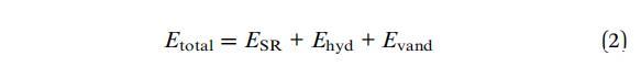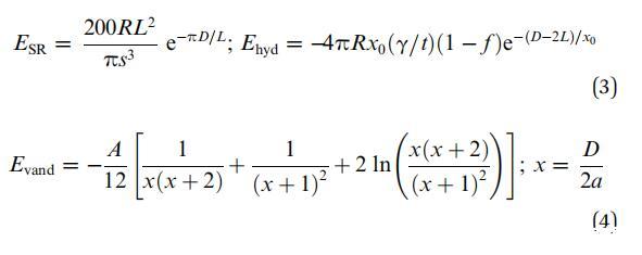 兩種平衡力在組裝的形成中起著重要作用:由兩種粒子之間的界面力控制的疏水相互作用,以及納米粘土團(tuán)簇和系統(tǒng)疏水環(huán)境之間的空間斥力。因此,復(fù)雜核-殼(粘土小體)組裝的總能量由以下三個(gè)貢獻(xiàn)的總和給出:相鄰納米粘土團(tuán)簇之間的空間斥力(ESR)、9疏水力(Ehyd)、9和范德華力(Evand):34