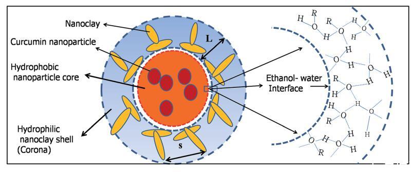 圖4示意圖顯示了在電暈中存在納米粘土團(tuán)和限制在疏水核內(nèi)的疏水姜黃素納米顆粒的粘土體結(jié)構(gòu)的形成。