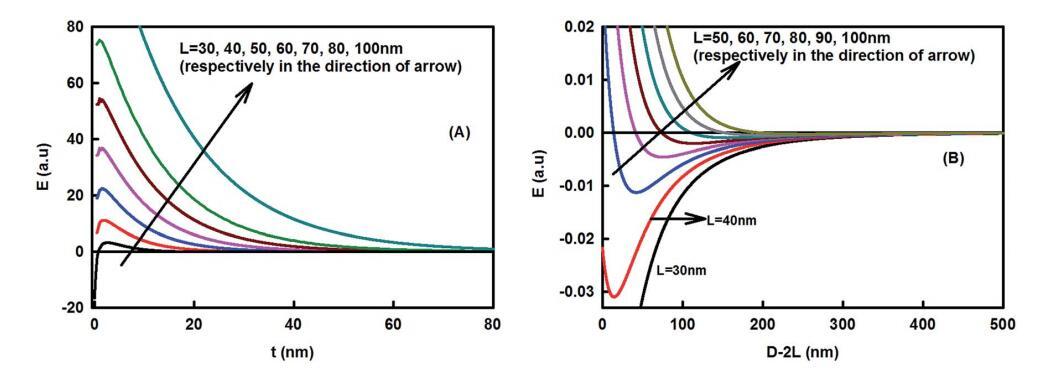 圖5納米粘土簇的長度對(duì)粘土小體組裝的影響。(A) 作為界面區(qū)域厚度函數(shù)的能量變化(s?60 nm;T?298 K,f?0.5;姜黃素納米顆粒半徑R?50 nm,疏水衰減長度x0?1 nm,界面張力?40 mN m-1)。(B) 粘粒–粘粒相互作用作為粒間分離D的函數(shù),使用方程(5)計(jì)算。當(dāng)存在大的納米粘土團(tuán)簇時(shí),能量最小值的深度減小,當(dāng)L>80nm時(shí),能量變得完全排斥。