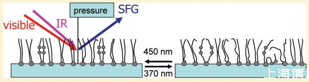 在此,我們研究了光開關(guān)脂質(zhì)DT Azo-5P(圖1)的單層,其為純的,并與脂質(zhì)1,2-二棕櫚酰-sn-甘油-3-磷酸膽堿(DPPC)混合。如圖1中的UV/vis光譜所示,光活性脂質(zhì)可分別用370和450 nm的光從其反式狀態(tài)切換到順式狀態(tài)并返回。我們將表面壓力測(cè)量與無標(biāo)簽、寬帶振動(dòng)和頻率產(chǎn)生(VSFG)光譜相結(jié)合。10這些技術(shù)使我們能夠研究空氣-水界面上的脂質(zhì)分子單層??梢垣@得有關(guān)脂質(zhì)與水分子相互作用的信息以及脂質(zhì)的分子結(jié)構(gòu)。在非線性光學(xué)技術(shù)VSFG中,紅外(IR)光束和可見光(VIS)光束在界面處組合,產(chǎn)生具有兩個(gè)入射光束和頻率的信號(hào)。如果紅外線與分子振動(dòng)共振,信號(hào)就會(huì)強(qiáng)烈增強(qiáng)。已經(jīng)證明,這種通過分子振動(dòng)的技術(shù)提供了有關(guān)脂質(zhì)分子構(gòu)象和取向的信息。11-18在中心對(duì)稱介質(zhì)中禁止和頻產(chǎn)生,因?yàn)檫@是一種二階非線性光學(xué)過程。19因此,該技術(shù)對(duì)中心對(duì)稱材料(如水表面)的最外表面分子層敏感。相反,缺少信號(hào)表明界面上的材料或分子群是中心對(duì)稱的。對(duì)于金表面偶氮苯功能化自組裝單分子膜,SFG在測(cè)定光異構(gòu)化的截面和機(jī)理方面非常有用。得出的結(jié)論是,光異構(gòu)化是由直接電子激發(fā)驅(qū)動(dòng)的,類似于液相中的偶氮苯