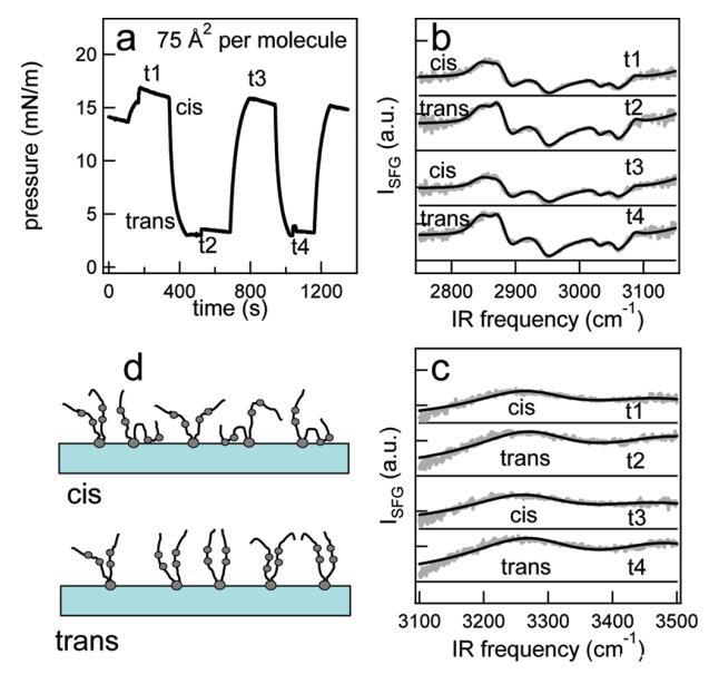 圖7。在脂質/H2O界面處,DT Azo-5P/d75 DPPC的1:5混合物的結果,每個分子的面積為30?2。(a) 表面壓力與時間的關系。用370和450 nm光照射~100秒分別產生順式(高壓)和反式(低壓)狀態(tài)。壓力的微小劇烈波動是由于樣品高度的變化,以校正水的蒸發(fā)。順式狀態(tài)下表面壓力的降低可能是由于單層的松弛或膠束或囊泡的形成減少了表面脂質的數(shù)量。(b) 相應的VSFG光譜(灰色)以及CD區(qū)域的擬合。為了清晰起見,光譜已被抵消。插圖顯示了相互重疊的反式和順式光譜,以強調差異。(c) VSFG光譜(灰色)以及用于引導眼睛進入CH區(qū)域的擬合。底部曲線顯示了在P時純d75 DPPC的光譜~ 40百萬/米。(d) 脂質尾部方向的示意圖。光開關脂質的偶氮苯部分用灰色圓圈表示。
