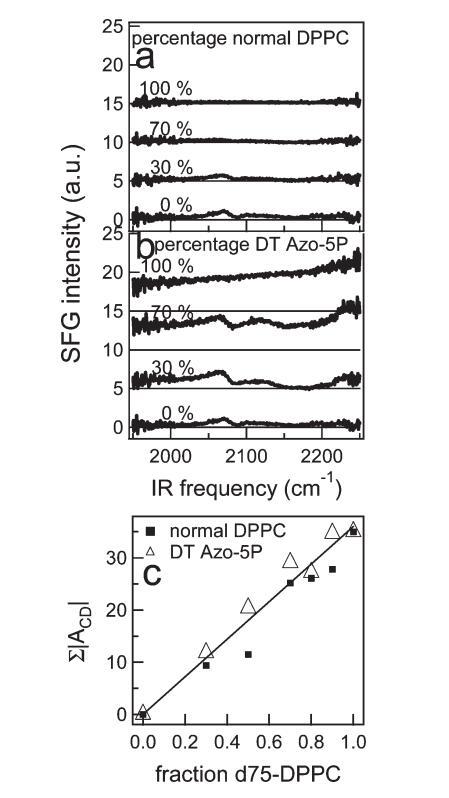 圖9。 (a) 正常DPPC和d75 DPPC不同混合物的CD區(qū)VSFG光譜。 圖中給出了混合物中正常DPPC的百分比。 為清晰起見,光譜偏移,細線表示零。 (b) 與a部分類似,但適用于DT Azo-5P與d75 DPPC的混合物。 (c) 通過擬合文中描述的VSFG光譜獲得的CD振動振幅之和,作為含正常DPPC或DT Azo-5P的二元混合物中分數(shù)d75 DPPC的函數(shù)。 在本實驗中,為了獲得混合物的高質量數(shù)據,IR通量很高,導致通過VSFG光譜中相對較高的CH2和CD2振幅觀察到的脂質尾部出現(xiàn)小的無序。