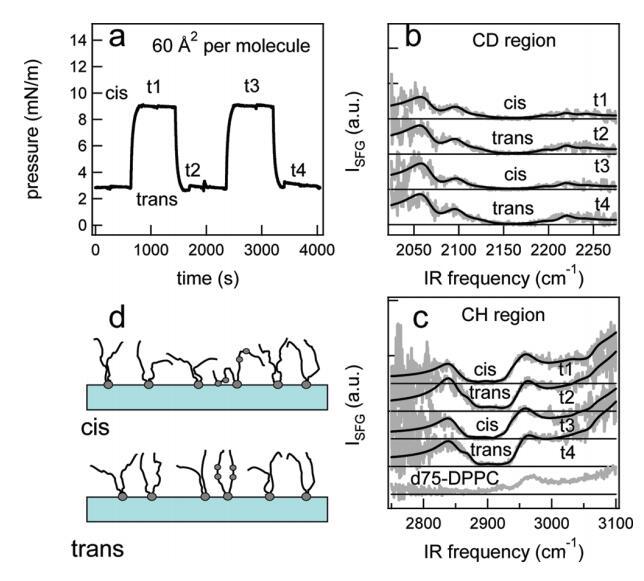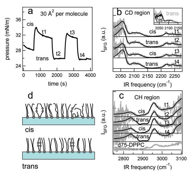 圖6。在脂質/H2O界面處,DT Azo-5P/d75 DPPC的1:5混合物的結果,每個分子的面積為60?2。(a) 表面壓力與時間的關系。用370和450 nm光照射~100秒分別產生順式(高壓)和反式(低壓)狀態(tài)。壓力的微小劇烈波動是由于樣品高度的變化,以校正水的蒸發(fā)。(b) 相應的VSFG光譜(灰色)以及CD區(qū)域的擬合。為了清晰起見,光譜已被抵消。(c) VSFG光譜(灰色)以及用于引導眼睛進入CH區(qū)域的擬合。底部曲線顯示了在P時純d75 DPPC的光譜~ 40百萬/米。(d) 脂質尾部方向的示意圖。光開關脂質的偶氮苯部分用灰色圓圈表示。