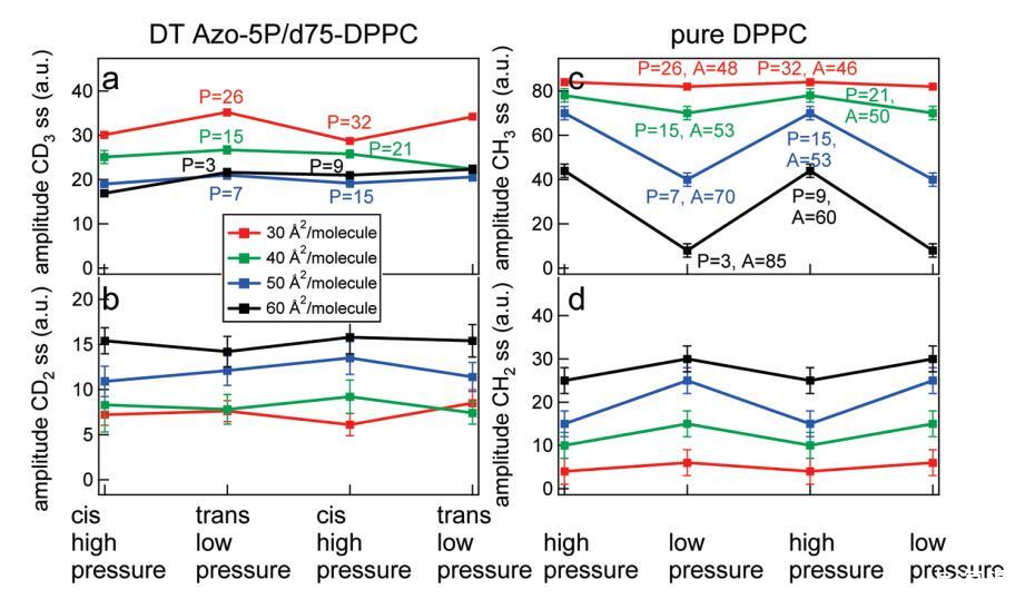 圖8.在d75 DPPC和DT Azo-5P(左)的5:1比率的實驗中,d75 DPPC和純正常DPPC(右)的擬合結果。(a)CD3對稱拉伸振動模式的振幅作為不同密度的光開關脂質狀態(tài)的函數(shù);(b)CD2對稱拉伸振動模式的振幅作為不同密度的光開關脂質狀態(tài)的函數(shù);右圖顯示了純DPPC的類似結果,壓力與左圖相似,其中(c)CH3對稱拉伸振動模式的振幅和(d)CH2對稱拉伸模式的振幅。共振的寬度和頻率在擬合中是固定的。