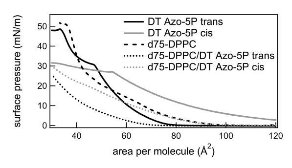 圖2。反式和順式狀態(tài)下的光開關脂質DT Azo-5P(實線)、d75-DPPC(虛線)以及光開關兩種狀態(tài)下的1:5摩爾比的光開關脂質和d75-DPPC(虛線)的表面壓力與面積等溫線。